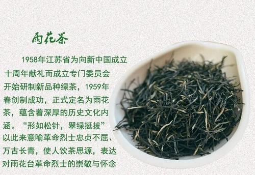 南京雨花茶是綠茶炒青中的珍品,也是中國三針之一,即:安化松針(半烘半炒),南京雨花(炒青),恩施玉露(蒸青),是優(yōu)質(zhì)細(xì)嫩針狀春茶,產(chǎn)于南京中山陵,雨花臺(tái)園林風(fēng)景區(qū),因此得名“雨花茶”。 雨花茶創(chuàng)制于1958年,是60年底代我國綠茶中嶄露頭角的新品名茶。