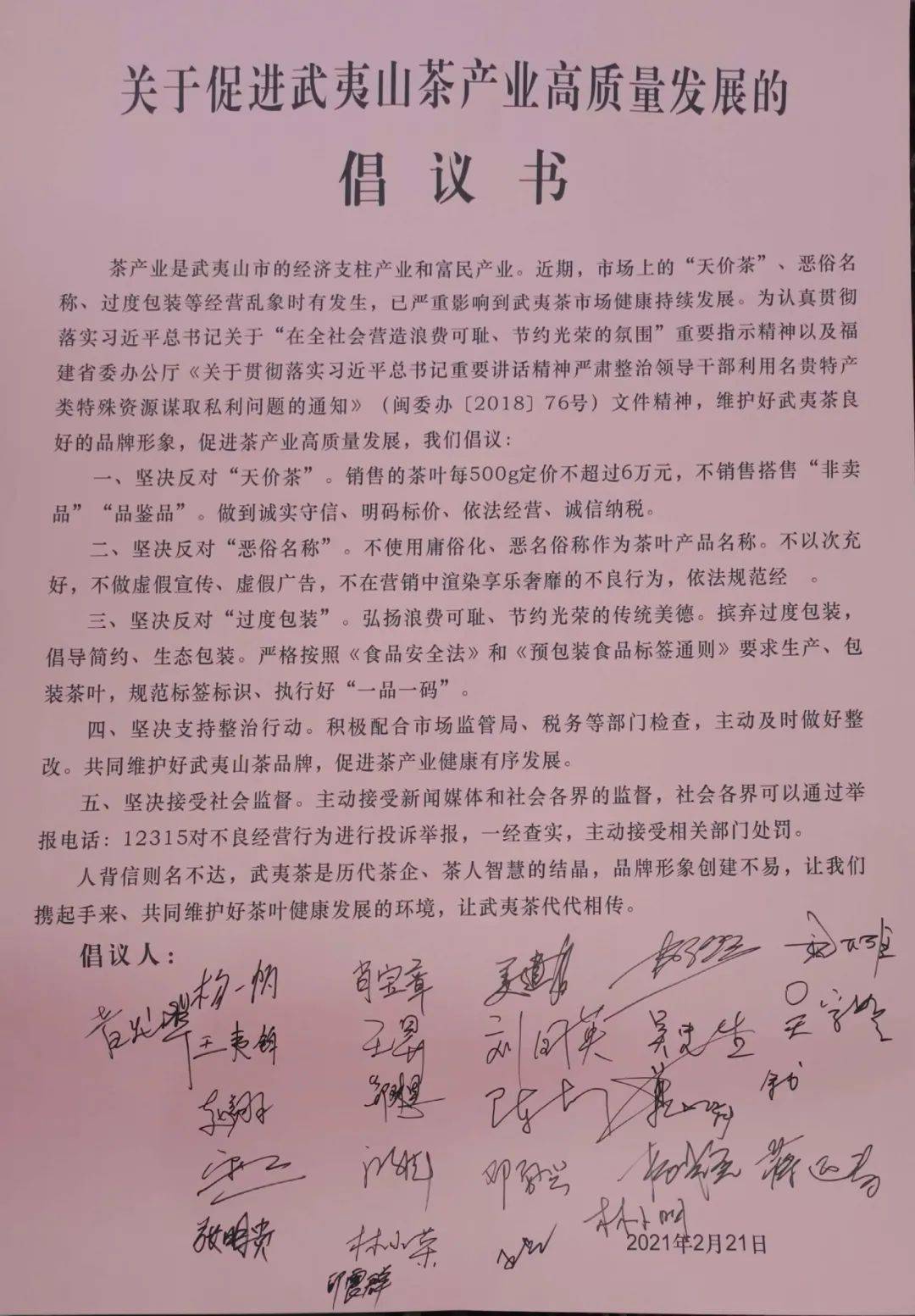 2月21日下午,武夷山市召開促進茶葉市場健康發(fā)展推進會,26家曾出現(xiàn)在網(wǎng)傳“天價茶”榜單上的武夷山茶企負責人共同簽署《關(guān)于促進武夷山茶產(chǎn)業(yè)高質(zhì)量發(fā)展的倡議書》,堅決反對“天價茶”,堅決反對“惡俗名稱”、“過度包裝”,承諾不做虛假宣傳,規(guī)范經(jīng)營管理,不銷售“非賣品”“品鑒品”,自覺接受監(jiān)督,如有違法違規(guī)行為,一經(jīng)查實,主動接受相關(guān)部門處罰。