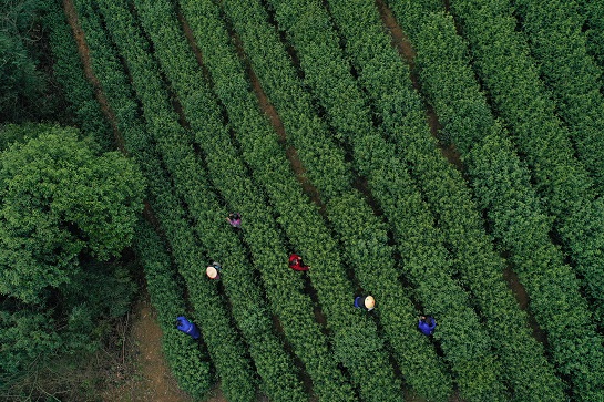 3月20日,采茶工在余杭區(qū)余杭街道竹園村的茶園采摘茶葉(無人機照片)。