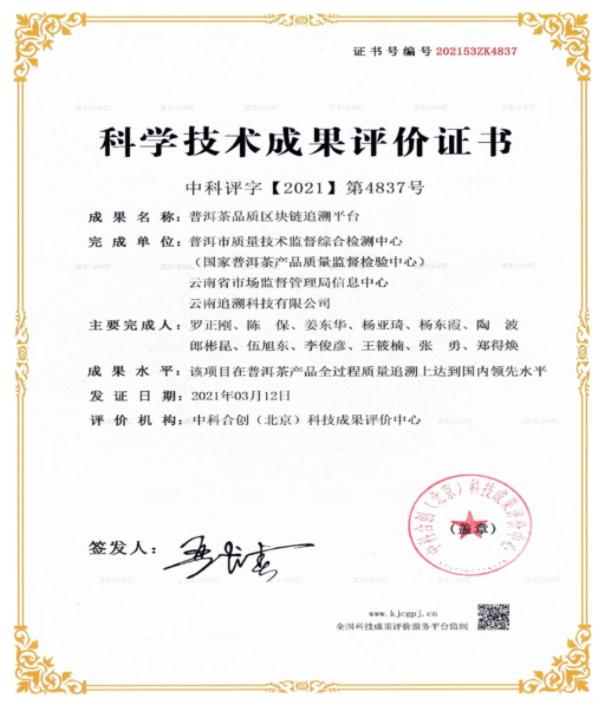 日前,第三方專業(yè)科技成果評價(jià)機(jī)構(gòu)依據(jù)科技部《科學(xué)技術(shù)評價(jià)辦法》,組織同行專家對國家普洱茶產(chǎn)品質(zhì)量監(jiān)督檢驗(yàn)中心完成的“普洱茶品質(zhì)區(qū)塊鏈追溯平臺”項(xiàng)目科技成果開展評價(jià)。