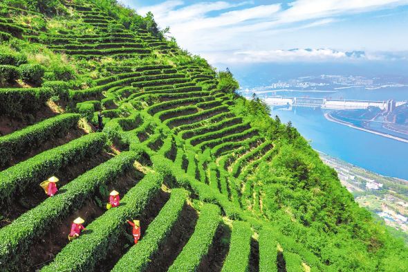 宜昌市夷陵區(qū)三斗坪鎮(zhèn)黃牛巖農(nóng)民利用梯田建設青云頂茶山小鎮(zhèn),發(fā)展農(nóng)旅融合產(chǎn)業(yè),讓游客體驗茶文化、觀賞大壩勝景。(湖北日報全媒記者 陳勇 攝)