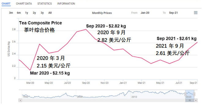 從產(chǎn)茶區(qū)域來看,茶葉價格趨勢喜憂參半。印度茶葉產(chǎn)量占到全球的20%。2021年9月份,印度茶葉出口量下降10%,但出口金額上漲。印度報告稱,在疫情爆發(fā)的一年里,印度本土茶葉價格下跌, 2021年上半年價格上漲。11月,加爾各答的紅碎茶拍賣價格降至2.78美元/公斤,2020 年同期為2.97美元/公斤。
